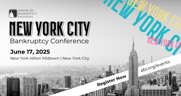 Save when you register today for ABI’s New York City Bankruptcy Conference on June 17 in Midtown Manhattan, an annual cornerstone event that brings together the brightest minds in insolvency and restructuring. One of ABI’s largest and most prestigious gatherings, this day-long conference is an essential platform for advanced learning and networking for those who practice in the New York metro area.